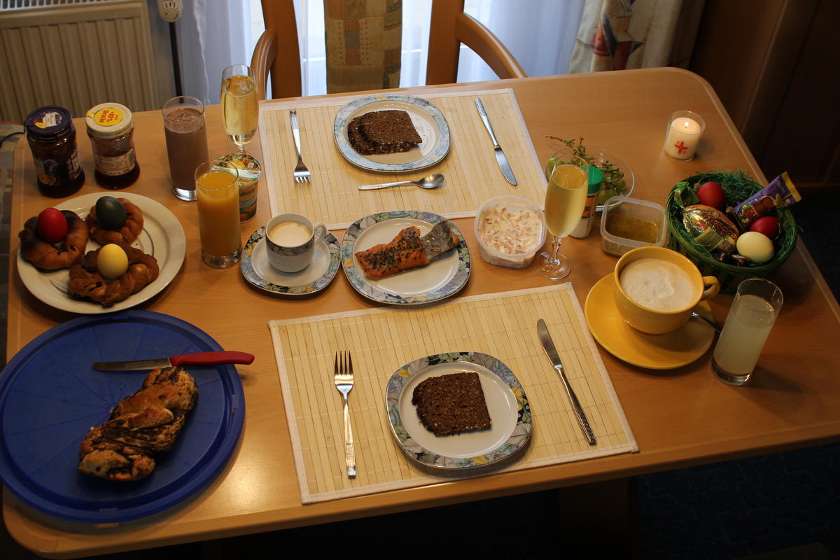 Wie gehabt beginnt der Tag mit Zeit im Bett. Die anschließende Laufrunde findet im Regen statt. Nach einem ausgiebigen Osterfrühstück fahren wir Fisch kaufen und schauen kurz beim Fischmarkt vorbei. Wieder daheim verschicke ich meine Geburtstagseinladungen und erledige Mails für die Schule. Cordula ist voll im Backwahn und erstellt Backwaren (Zopf, Apfel-Marzipan-Eier, Schokosouffle als Nachtisch). Nebenbei nehmen wir noch eine Folge Traumschiff mit und kochen abends groß auf: in Sesam panierter Lachs mit glasierten Möhren und Brokkoli.