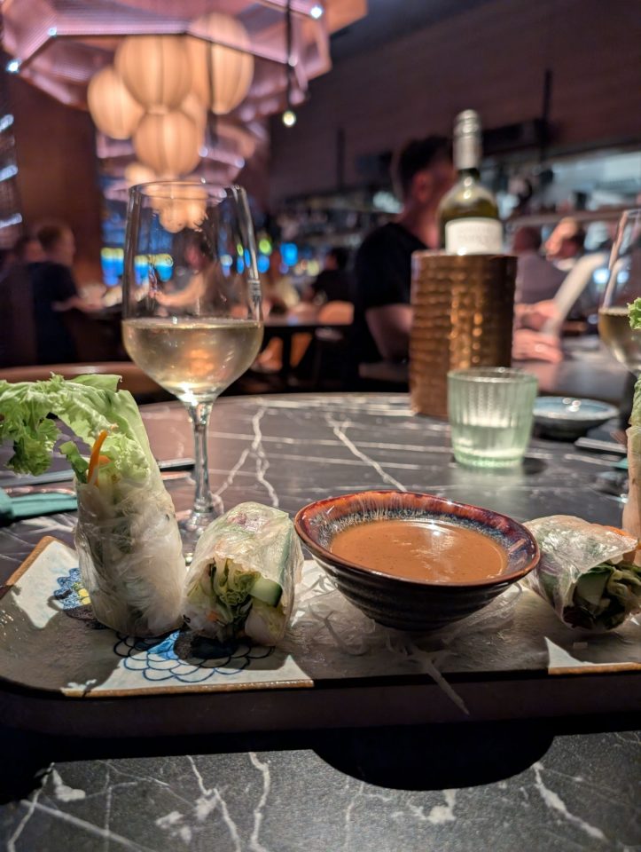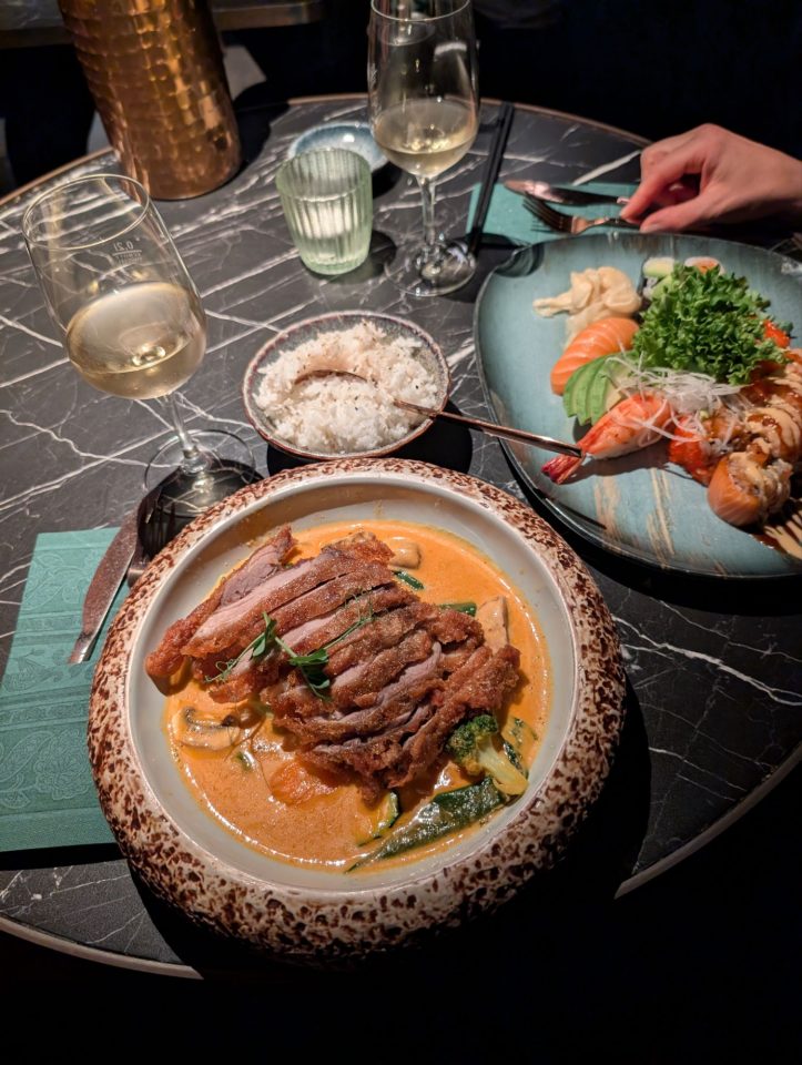 Cordula und ich genießen zu zweit ein ruhiges Abendessen im 1987 Xigon. Cordula nimmt Sushi und ich ein Red Curry mit Ente. Es ist mega-lecker.