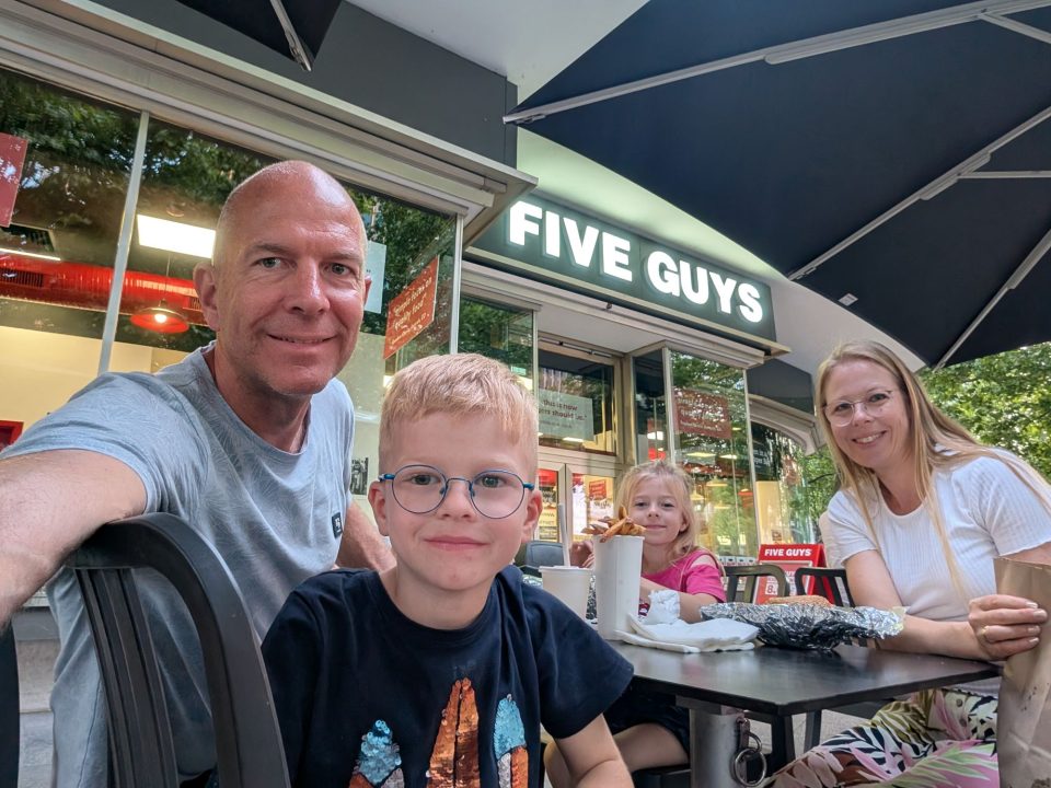 Mit der Buslinie 100 fahren wir wieder zum Ku’damm, wo wir uns erst schwer tun, für die Kinder etwas zu essen zu finden, dann aber beide (und somit uns auch) mit den Five Guys zufriedenstellen.