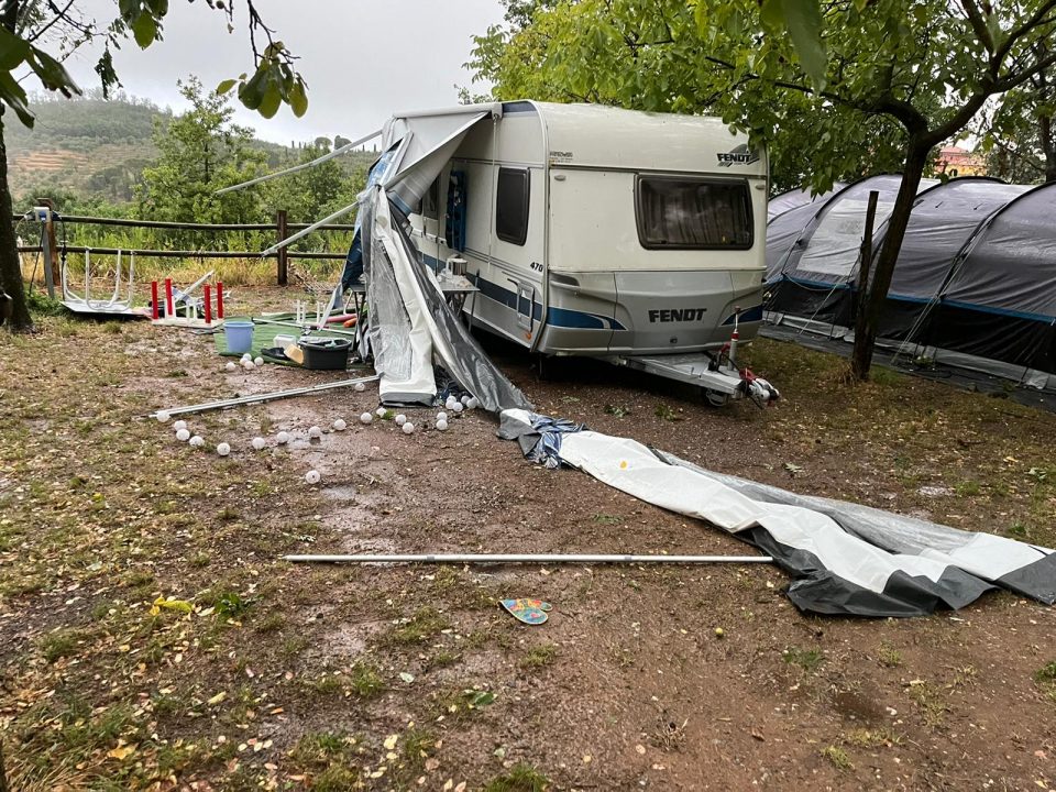 Wir fahren im Aufzug nach unten, steigen aber nicht aus, weil wir sonst innerhalb kürzester Zeit komplett nass wären. Also warten wir im Aufzug. Hier kann uns zum Glück nichts passieren. Also, fast nichts. Es gibt einen Stromausfall und für ca. eine Minute geht das Licht aus. Als es wieder an geht, lässt sich die Tür über den Schalter öffnen und wir sehen, dass das Schlimmste überstanden ist. Vor dem Obi, wo der Aufzug ankommt, liegen alle Pflanzen kreuz und quer, Schilder sind umgefallen und überall liegen Blätter und stehen Pfützen. Lorena und Samuel sind total verängstigt. Wahrscheinlich verläuft der anschließende Einkauf im Decathlon deshalb so entspannt. Als wir fertig sind, muss Samuel getragen werden und Lorena wehrt sich schreiend dagegen, dass wir den Laden verlassen. Irgendwann geht es dann doch und wir gehen weiter zum Coop. Nach dem Einkauf fahren wir heim. Während der Heimfahrt wird uns angesichts der herumliegenden Blätter und Äste immer mulmiger, da die größte Verwüstung genau auf einem Streifen liegt, der zu unserem Campingplatz führt. Dort angekommen, werden wir bereits von unseren holländischen Nachbarn an der Rezeption gestoppt: „Be prepared!“ Sie bereiten uns schon auf das vor, was uns erwartet: das Vorzelt wurde vom Sturm weggerissen. Dabei wurde auch die Markise zerstört. Die Gelenkarme wurden am vorderen Querbalken abgerissen. Es sieht verheerend aus. Naja, Hauptsache uns ist nichts passiert. Blöd, dass der Urlaub erst begonnen hat und wir so lange ohne Markise und Vorzelt auskommen müssen.