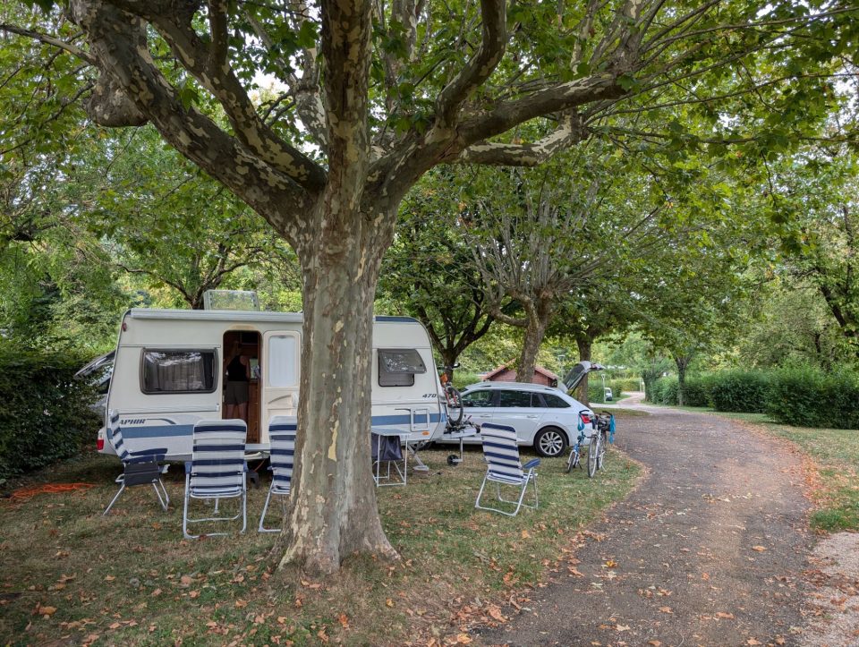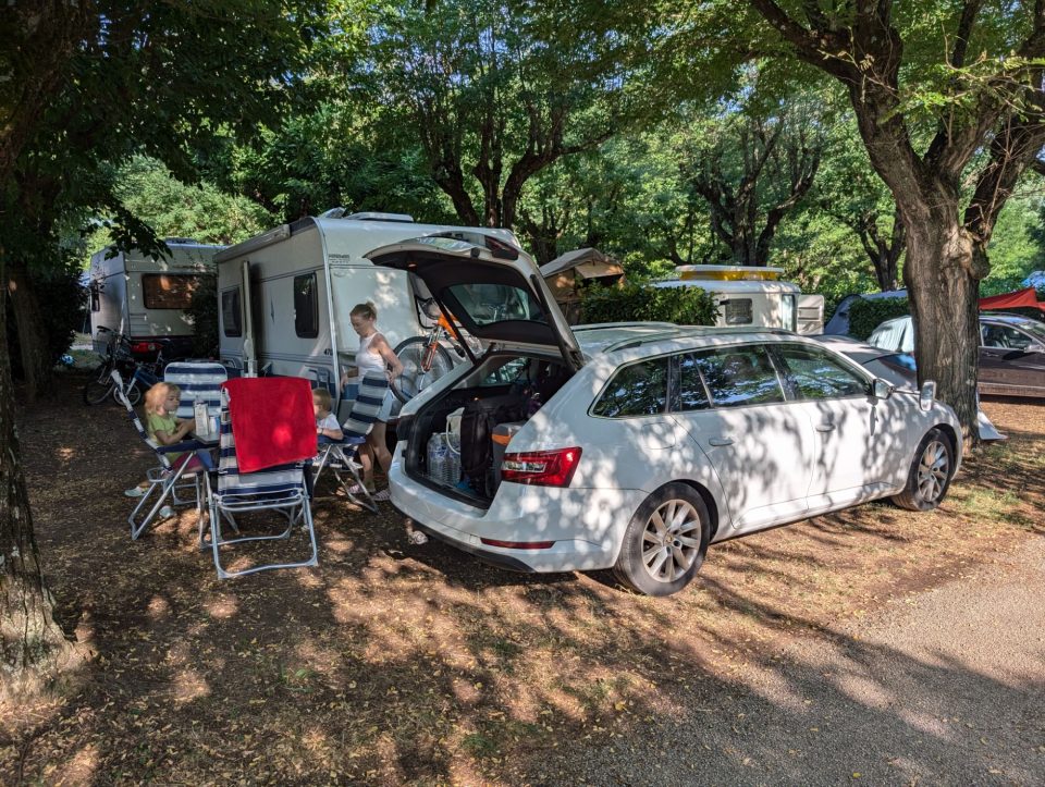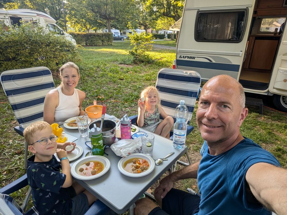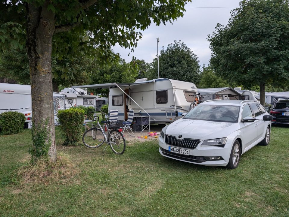 Beim Anstehen wird uns allen noch kälter. Ich rutsche einmal mit Samuel, er dann noch ein weiteres Mal mit Lorena. Danach reicht es uns Erwachsenen – Lorena rutscht noch ein paar Mal alleine weiter. Schließlich bleiben wir noch ein paar Minuten im Wasser, bevor wir unsere sieben Sachen packen und zurück zum Wohnwagen gehen.