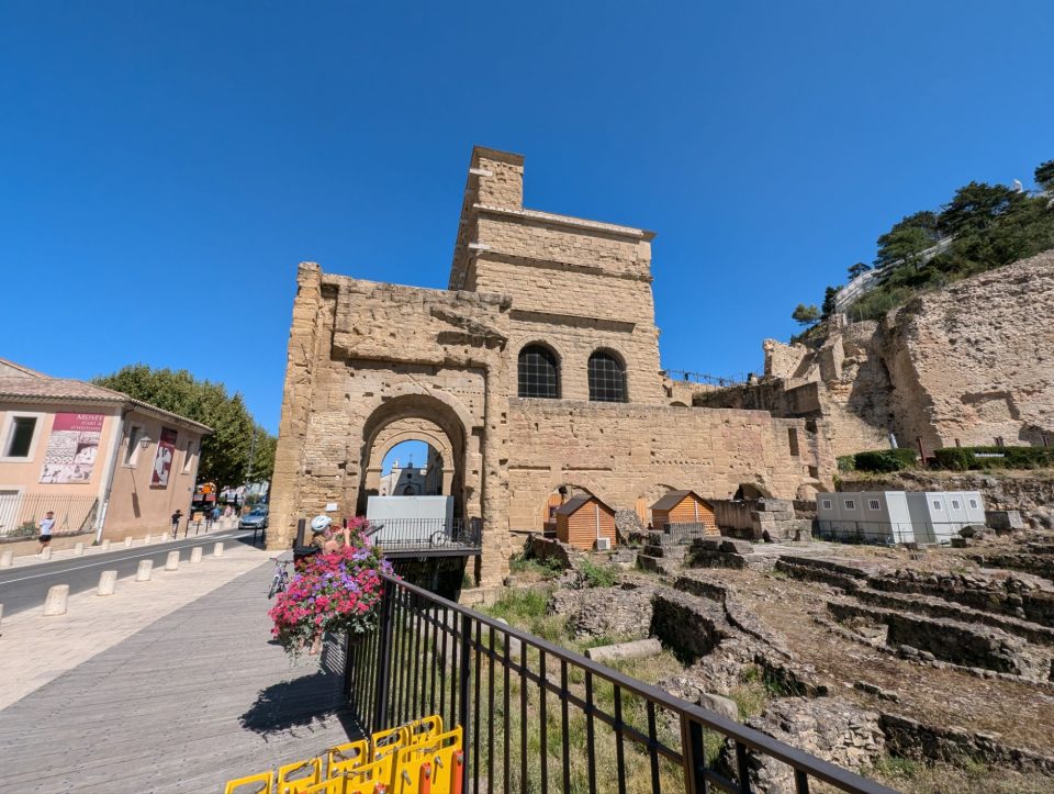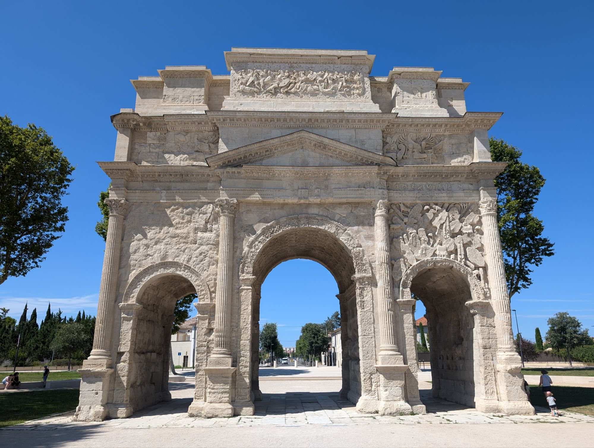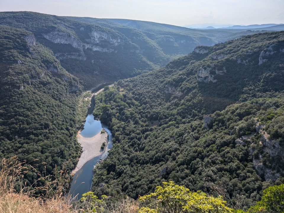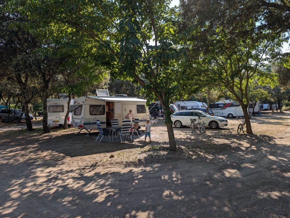 Nach dem Frühstück machen wir uns auf, die riesige Campingplatzanlage zu erkunden. Wir laufen hinunter zum Strand – der laut Werbung ein Sandstrand sein soll. In Wirklichkeit handelt es sich jedoch um einen Steinstrand mit aufgeschüttetem Sand dahinter, getrennt durch Betonstufen. Marketing-Zauber eben.
