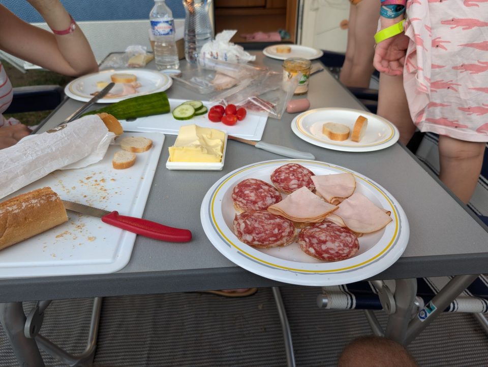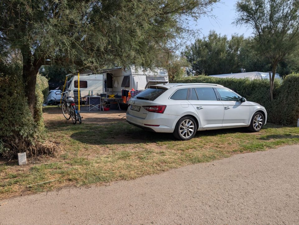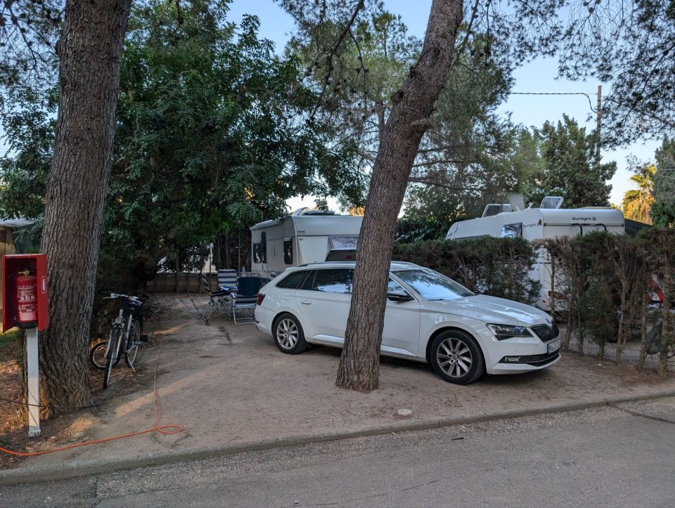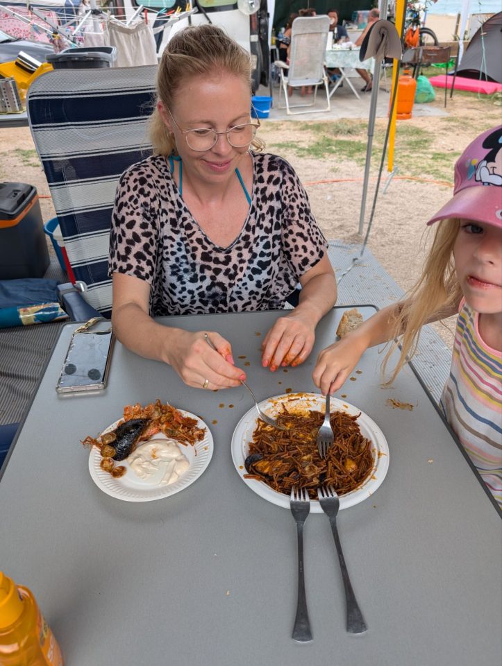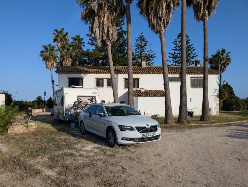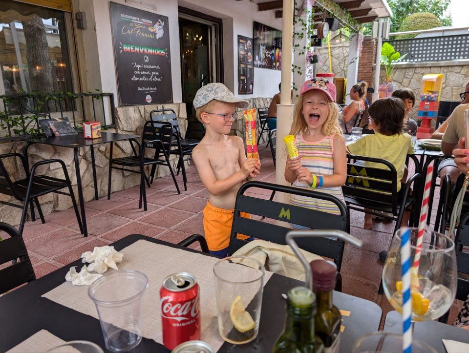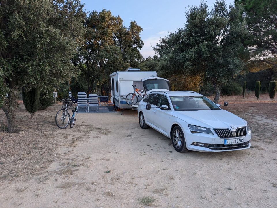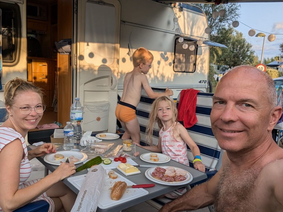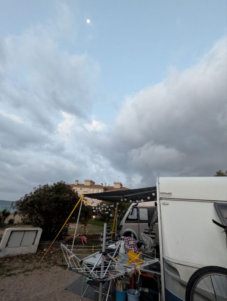 Dann übernehmen wir wieder und führen die Kinder zu einer Eisdiele. Samuel ist ganz flott, Lorena zelebriert ihre eine Kugel für 4€ wieder einmal und braucht knapp 20 min bis sie fertig ist. Jetzt aber schnell zurück zum Auto, denn es ist inzwischen kurz vor 18.00 und bis zum angepeilten Campingplatz Albera, der um 19.30 schließt, haben wir noch 50 min Fahrt vor uns. Lorena und Samuel machen super mit und wir kommen um 18.15 in Girona los. Der Stopp hat sich auf jeden Fall gelohnt. Zum Glück kommen wir ohne Stau durch und erreichen den etwas abgeschieden gelegenen Campingplatz kurz nach 19.00. Wir suchen uns einen Stellplatz (es ist wenig los und es gibt genügend Plätze) und während ich alles auspacke und aufbaue, geht Cordula noch kurz eine Runde schwimmen mit Lorena und Samuel. Das tut den beiden gut. Um kurz nach 20.00 kommen sie zurück und wir essen mit Einbruch der Dunkelheit. Als wir fertig sind, entdeckt Samuel sogar noch einen Satellit am klaren Nachthimmel. Im Bett liegend braucht Samuel noch kurz bis er runterkommt. Um 22.00 schlafen die Beiden.