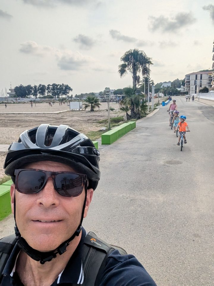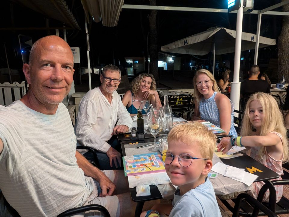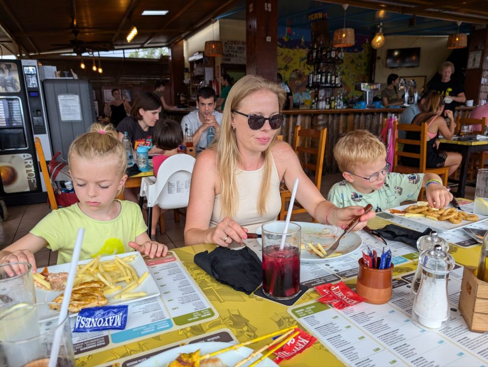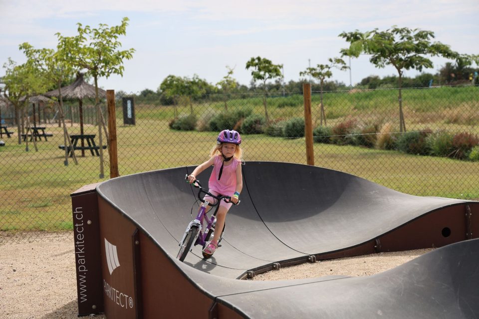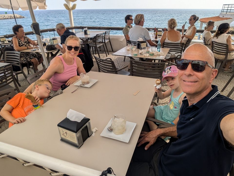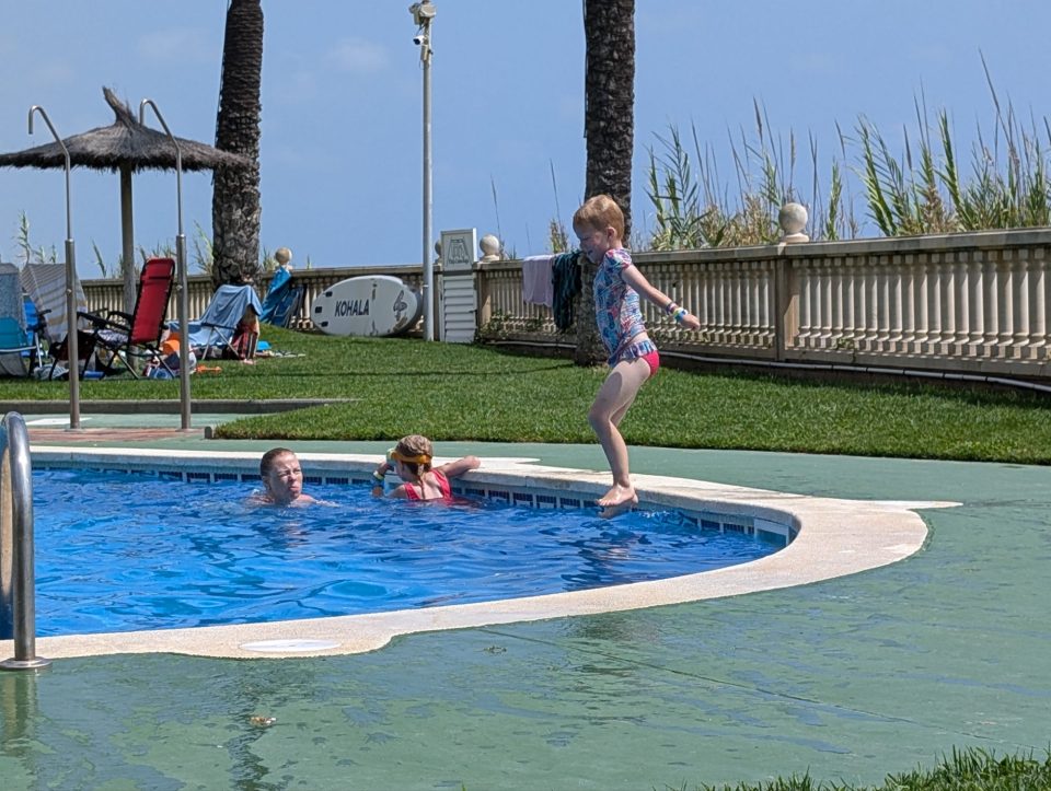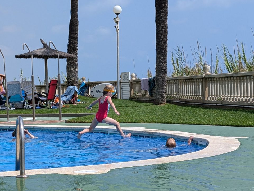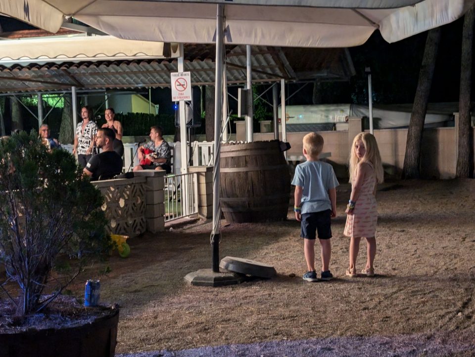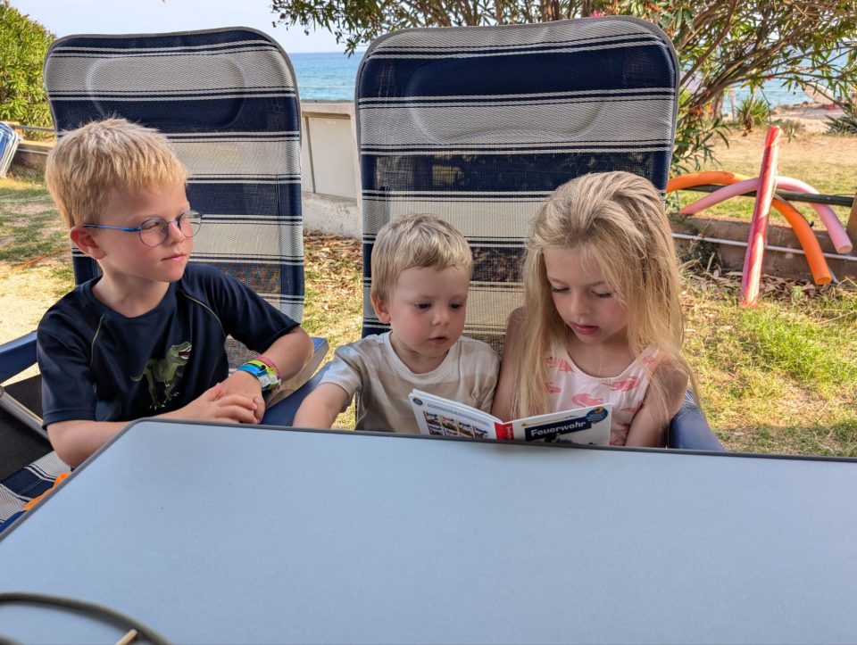 Dann übernehmen wir wieder und führen die Kinder zu einer Eisdiele. Samuel ist ganz flott, Lorena zelebriert ihre eine Kugel für 4€ wieder einmal und braucht knapp 20 min bis sie fertig ist. Jetzt aber schnell zurück zum Auto, denn es ist inzwischen kurz vor 18.00 und bis zum angepeilten Campingplatz Albera, der um 19.30 schließt, haben wir noch 50 min Fahrt vor uns. Lorena und Samuel machen super mit und wir kommen um 18.15 in Girona los. Der Stopp hat sich auf jeden Fall gelohnt. Zum Glück kommen wir ohne Stau durch und erreichen den etwas abgeschieden gelegenen Campingplatz kurz nach 19.00. Wir suchen uns einen Stellplatz (es ist wenig los und es gibt genügend Plätze) und während ich alles auspacke und aufbaue, geht Cordula noch kurz eine Runde schwimmen mit Lorena und Samuel. Das tut den beiden gut. Um kurz nach 20.00 kommen sie zurück und wir essen mit Einbruch der Dunkelheit. Als wir fertig sind, entdeckt Samuel sogar noch einen Satellit am klaren Nachthimmel. Im Bett liegend braucht Samuel noch kurz bis er runterkommt. Um 22.00 schlafen die Beiden.