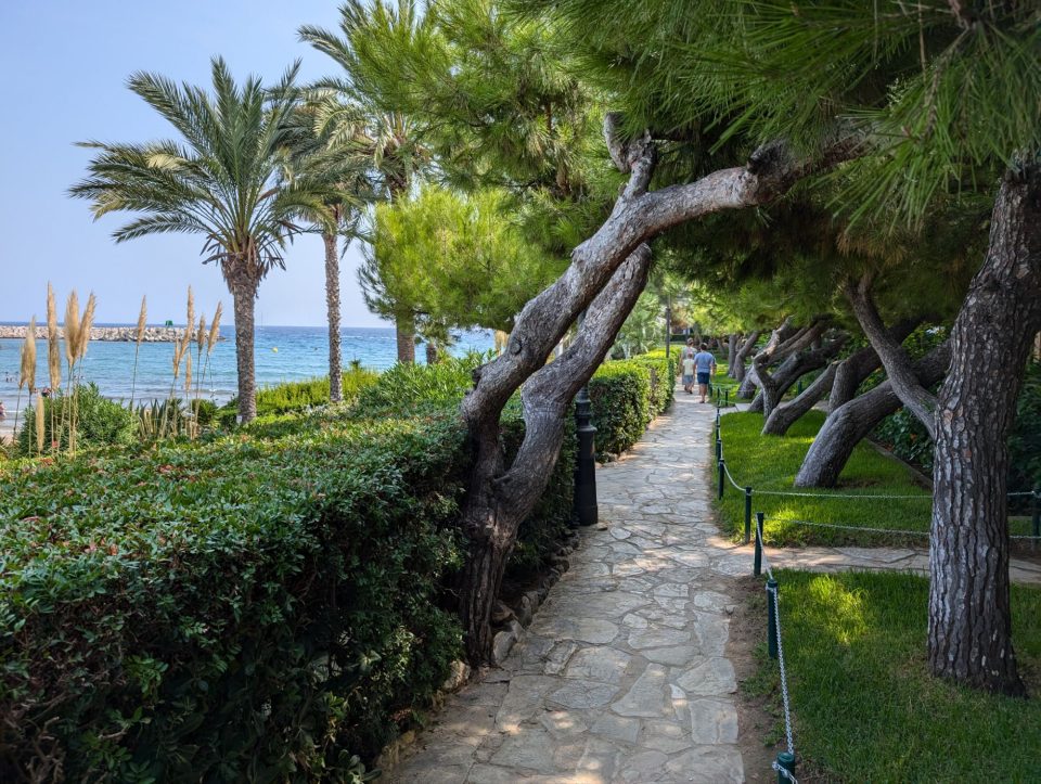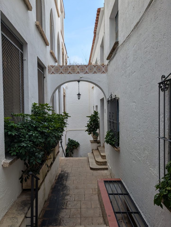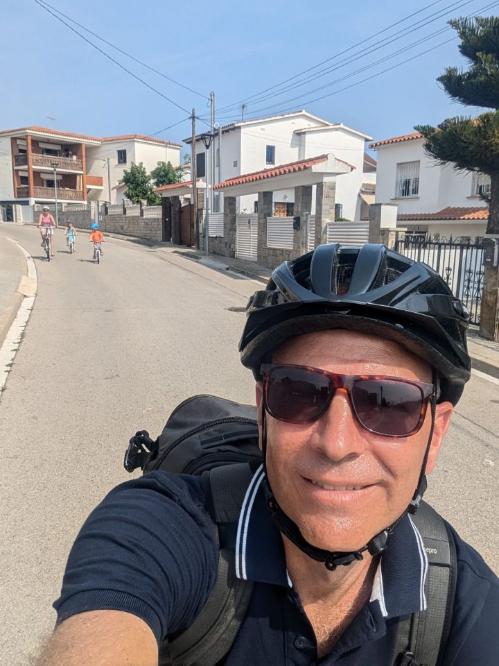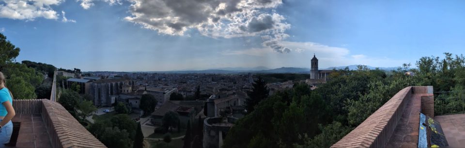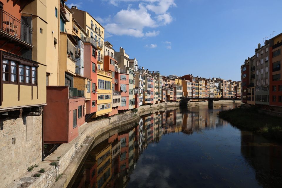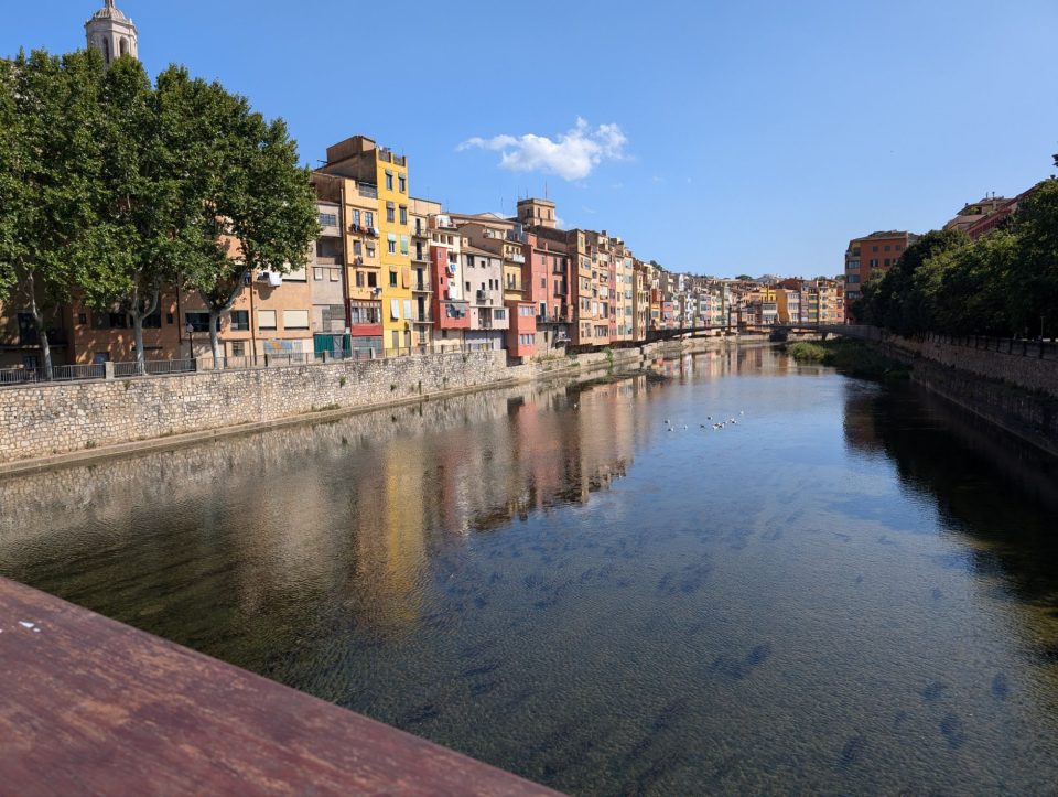 Um Punkt 12.00 starten wir. Der erste Ausparkversuch misslingt, weshalb ich den Weg vor mir einfach weiterfahren. Dort stehen auch andere Wohnwägen und parkende Autos. Zweimal um die Kurve und dann Richtung Ausfahrt. Leider wird der Weg immer enger und kurviger und wir bleiben stecken, weil ich sonst das Gestänge eines Pavillons beschädigen würde. Also kuppeln wir ab und schieben den Wohnwagen ein Stück wo es sehr eng ist. Dann wieder ankuppeln und weiterfahren. Aber nur einen Meter, denn ich würde sonst eine Hecke kaputtfahren. Also wieder ankuppeln, schieben, ankuppeln weiterfahren. Dieses Mal kommen wir immerhin bis zum Supermarkt, wo ich wieder nicht um die Kurve kommen würde. Ein drittes Mal abkuppeln. Zwei Spanier helfen uns und schieben den Wohnwagen um die Kurve. Zum letzten Mal kuppeln wir an und brausen dann ab in Richtung Norden. Hin und wieder ist es mehr Verkehr, aber zum Glück kein richtiger Stau. Um 15.00 erreichen wir Girona und parken auf einem Busparkplatz. Wir laden die Räder ab, cremen uns ein und radeln die 1,5 km bis an den Fluss, an dem die schönen bunten Häuser stehen. Dort ist der erste lohnenswerte Fotostop.